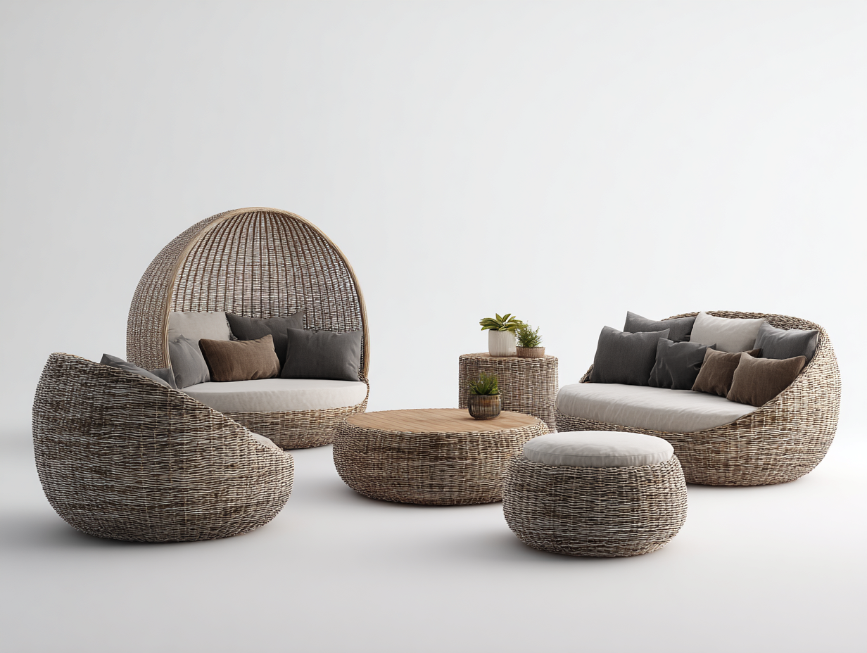 El conjunto incluye diferentes tipos de asientos que permiten organizar un espacio de descanso amplio y confortable. Los respaldos curvados y los asientos profundos ofrecen una experiencia cómoda. La mesa central y la mesa auxiliar proporcionan superficies prácticas para colocar bebidas u objetos decorativos durante el uso diario.