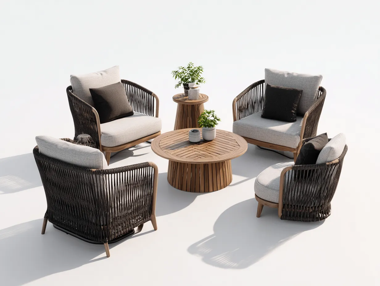 Este conjunto pertenece a la categoría Conjunto de muebles de jardín y está diseñado para crear una zona cómoda de descanso en terrazas, patios o jardines. La combinación de sillones amplios con una mesa central permite formar un espacio agradable para conversar o relajarse al aire libre. El diseño natural y equilibrado facilita su integración en distintos ambientes exteriores.
