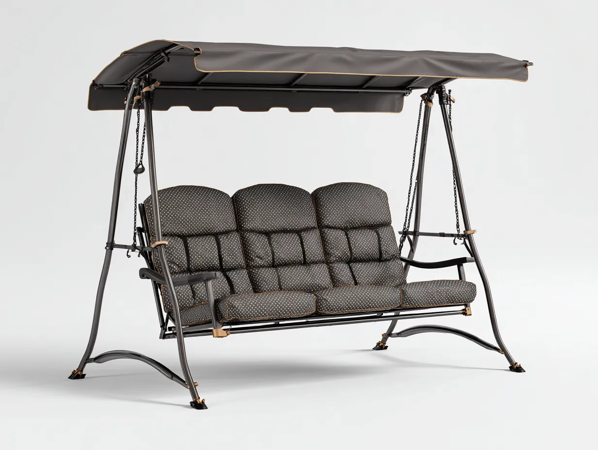 La estructura está fabricada en acero resistente con acabado en color negro que aporta estabilidad y durabilidad. El asiento incorpora cojines acolchados de tela en color gris que proporcionan comodidad durante el uso. La parte superior cuenta con un dosel de tela que ayuda a ofrecer sombra durante el descanso al aire libre.