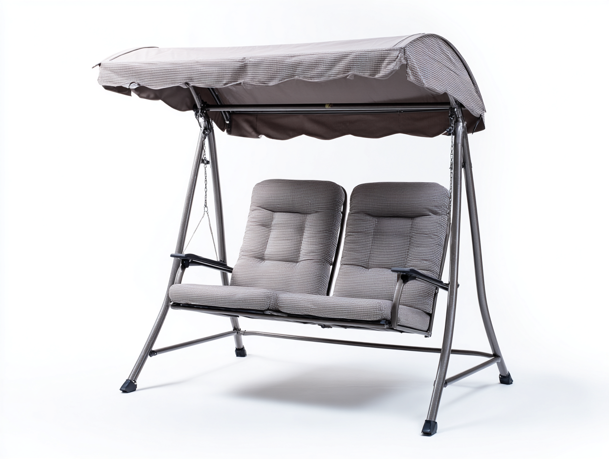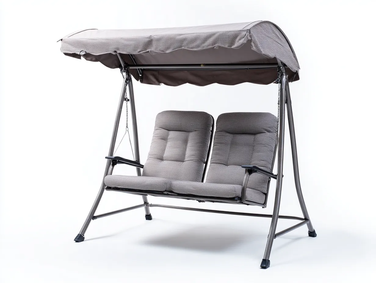 La estructura está fabricada en acero con acabado en color negro que proporciona estabilidad y resistencia. El asiento incorpora cojines acolchados en color gris con una superficie suave que aporta comodidad durante el uso diario. El toldo superior está elaborado en tejido resistente adecuado para el uso exterior.
