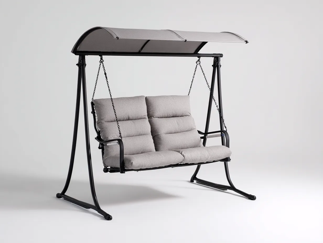 La estructura está fabricada en metal resistente que ofrece estabilidad y durabilidad para uso exterior. El asiento incorpora cojines acolchados tapizados en tejido de color gris claro que proporciona comodidad durante el uso. El toldo superior ayuda a proporcionar sombra y a mejorar el confort en días soleados.