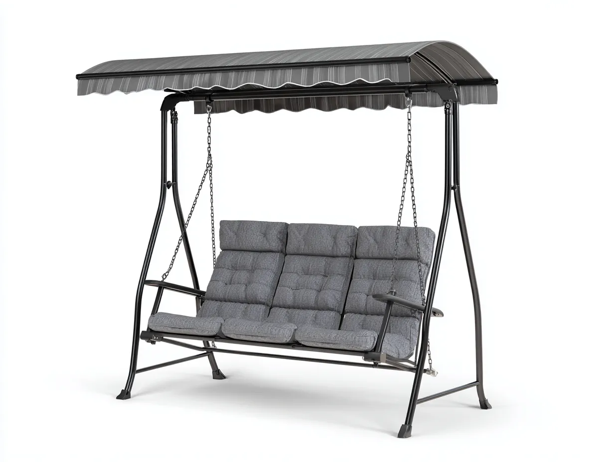 La estructura principal está fabricada en metal resistente que proporciona estabilidad y durabilidad para uso exterior. El asiento incorpora cojines acolchados tapizados en tejido de tono gris oscuro que ofrece comodidad durante el uso. El toldo superior está diseñado para aportar sombra y mejorar el confort durante los días soleados en el jardín.